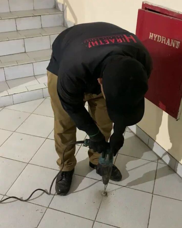 Lubang dibuat dengan bor khusus di lantai, biasanya setiap 30–50 cm tergantung struktur bangunan dan tingkat penyebaran rayap. - Penyuntikan Insektisida